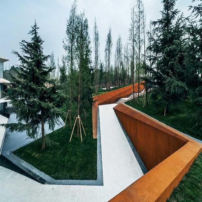 耐候鋼板會隨著時間而發生變化。其色彩明度和飽和度比一般的構筑物材料要高,因此在園林綠植背景下更容易突顯出來。